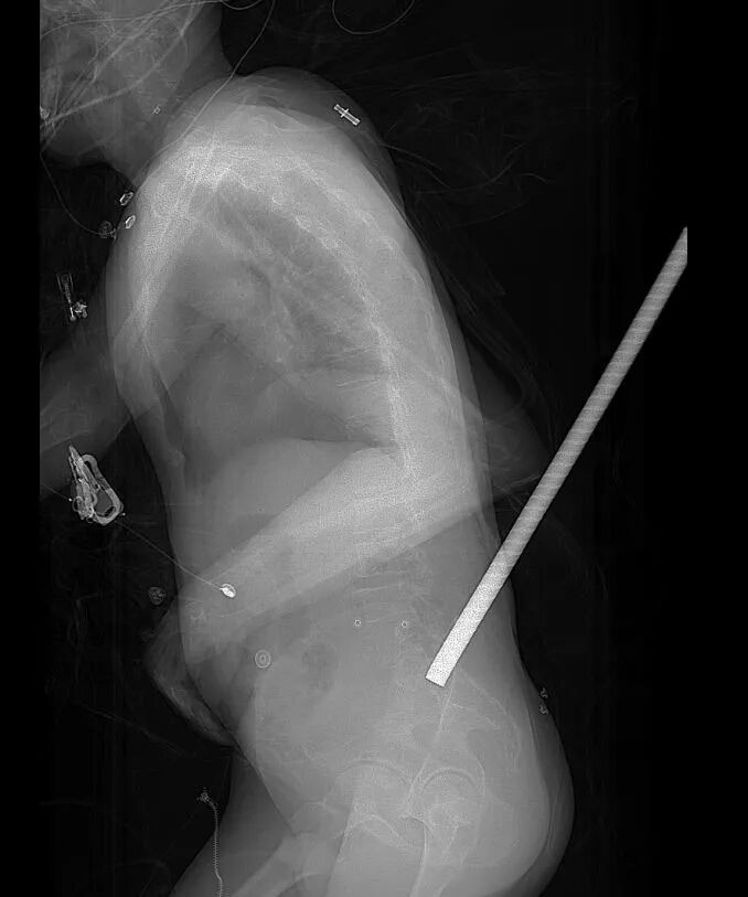 会诊结束后,患者直接从CT室转运至手术室,麻醉手术室团队早已准备好,实现无缝衔接。手术由脊柱外科张文斌主任医师、马子平副主任医师主刀,外科医生待命随时支援,团队先将42厘米长的钢筋完整取出,再细致开展清创与脊柱修复工作。整个手术衔接有序,最终顺利完成,患者术后被转入EICU,目前生命体征平稳。