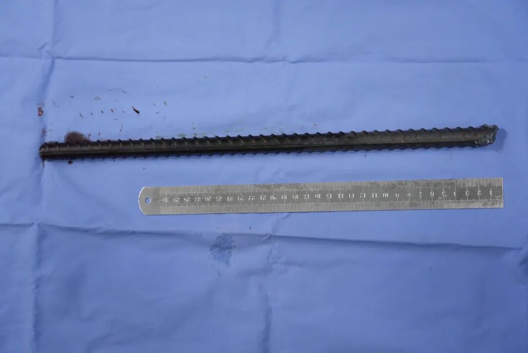 考虑到长钢筋不便转运,现场救援人员紧急将外露部分切割缩短,处理妥当后患者被火速送医。经检查,钢筋残留体外部分42厘米,体内嵌入长度约十几厘米。