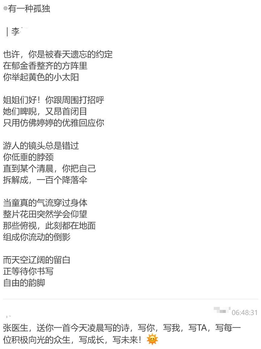 术前,心胸外科及麻醉科手术团队为李女士量身定制个性化手术方案,术后李女士回到病房即可下床活动,2小时就能正常进食。术后第一天,复查胸片显示李女士肺复张良好,精神状态极佳的她看着窗外的天光,灵感迸发,提笔写下短诗:“你举起黄色的小太阳……整片花田突然学会仰望”,把对医护团队的谢意和康复后的轻快心境都融入了诗句中。