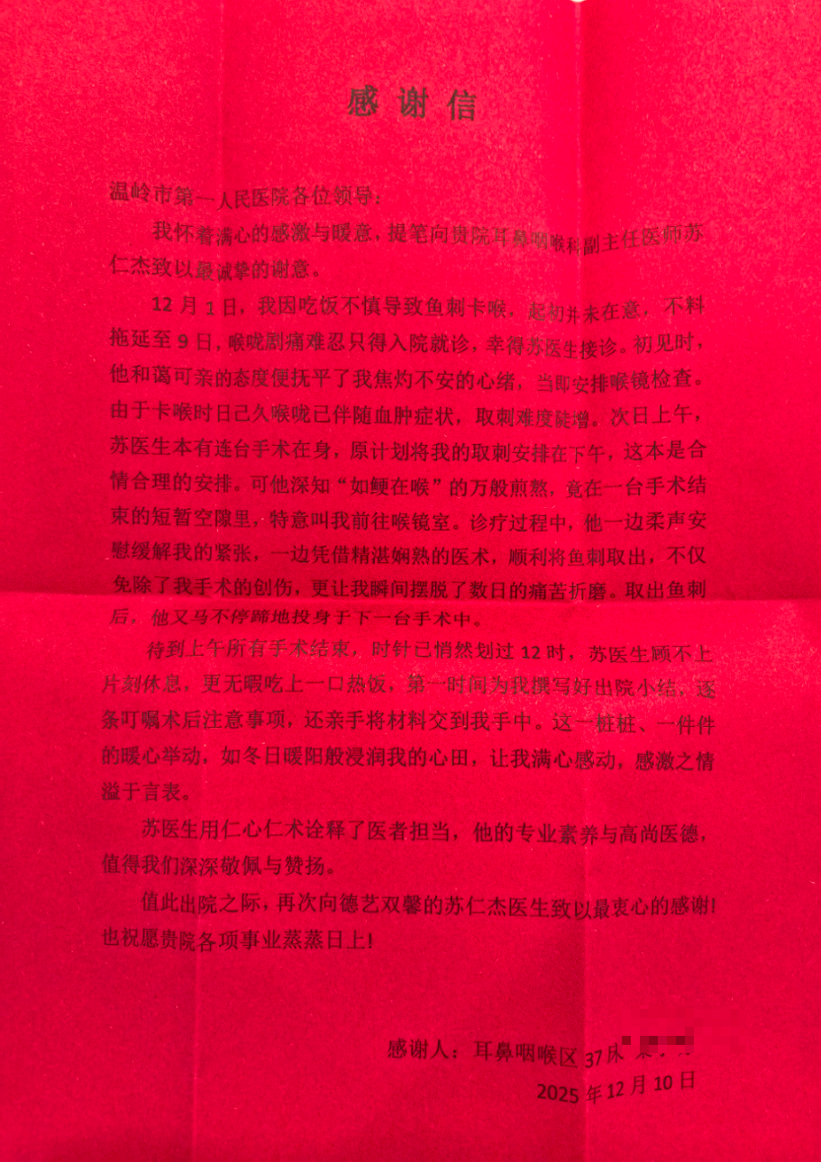 近日,温岭市第一人民医院耳鼻咽喉科,收到了一封红底黑字的感谢信——字里行间,全是患者梁先生对耳鼻喉科苏仁杰副主任医师的满满感激。 事情要从12月1日说起:梁先生吃饭时不慎卡了鱼刺,一开始没当回事,这一拖就是8天!等到12月9日来院时,喉咙已经肿得像“小灯笼”,连视频喉镜都没法顺利找到,按照常规情况,可能得通过手术才能取出这根“顽固”鱼刺。 入院后,苏医生先安排了用药消肿,心里却始终记挂着:“能不手术就尽量帮患者少遭罪!”。等肿胀稍退,他决定:“再试一次喉镜取刺,不行再考虑手术!” 可当天苏医生排满了连台手术,原计划把取刺安排在下午。但一想到梁先生“咽口水都疼”的煎熬,他在一台手术刚结束的短暂空档里,立刻叫上梁先生往喉镜室赶: 诊疗时,他一边柔声安抚缓解紧张,一边凭精准的操作顺利夹出了鱼刺——不仅免了手术创伤,梁先生瞬间就说“喉咙松快了”!取完刺,苏医生马不停蹄又扎进了下一台手术。 等到上午所有手术结束,时针已经悄悄划过12点。苏医生顾不上歇口气、吃口热饭,第一时间写好了出院小结,逐条叮嘱“这两天别吃硬的、烫的食物”,还亲手把材料递到了梁先生手里。 纸短情长,感谢信里的字字句句,是苏仁杰医生用“仁心+技术”织起的医患暖意——专业是底气,暖心是日常。