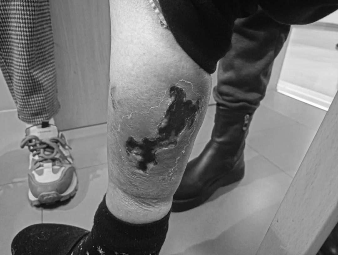 电热毯也是温岭人冬天常用的取暖神器,用错了同样危险。有位市民晚上怕冷,整夜开着电热毯,脚直接贴在上面,第二天醒来,腿部就起了一片片烫伤印,又红又硬还轻微溃烂。