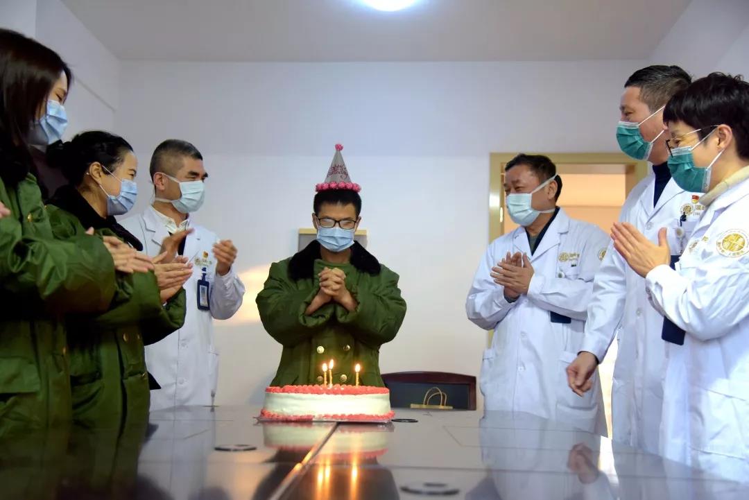 1月29日下午,在温岭市第一人民医院宿舍楼,一场特殊而温馨的生日会正在举办,冲淡了隔离区内紧张、焦虑的氛围。 生日会的主角是医院呼吸内科主治医师林青岳,他也是目前正在参与抗击新型冠状病毒肺炎的党员医务人员。虽然这个生日会迟到了两天,但是林青岳心中还是充满了惊喜与感动。原来,1月27日是林青岳的生日。但是,当天他正是隔离区工作,压根没顾上。没想到,医院在统计信息时,无意中发现这事,于是决